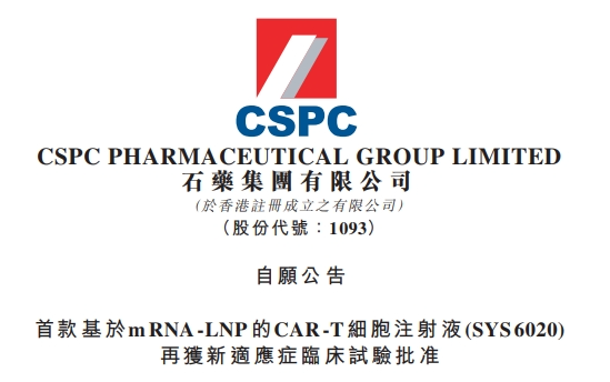 宣布,本集团开发的首款基于mRNA-LNP的嵌合抗原受体(CAR)-T细胞注射液(SYS6020)(“该产品”)已获中华人民共和国国家药品监督管理局批准,可以在中国开展重症肌无力(MG)适应症的临床试验。此前,该产品已经获得多发性骨髓瘤(MM)以及系统性红斑狼疮(SLE)的临床试验批准。
