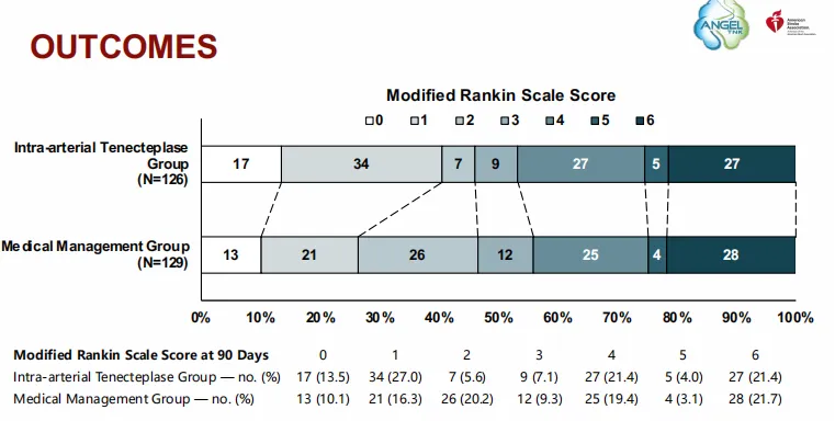 在反桥接治疗方面,ANGEL-TNK旨在研究发病4.5-24h的急性前循环大血管闭塞患者,机械取栓再通后,动脉内注射替奈普酶溶栓的疗效和安全性。研究由首都医科大学附属北京天坛医院缪中荣教授团队主导,该研究纳入256例受试者,主要终点为90天mRS评分0-1分的患者比例。
