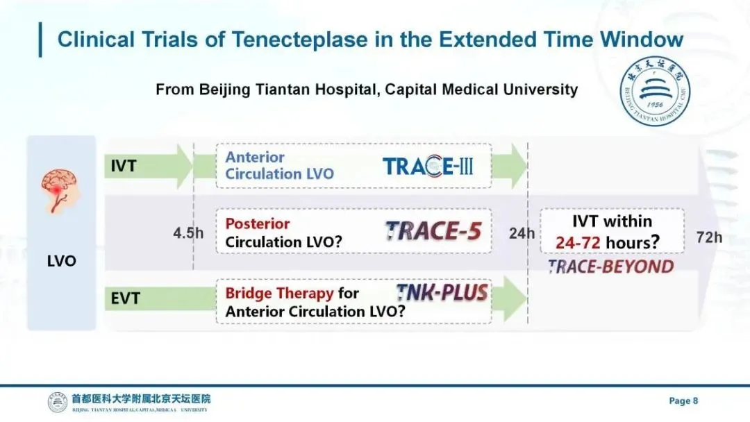 此外,首都医科大学附属北京天坛医院王拥军教授团队正在同步开展多项随机对照试验,持续深耕拓展静脉溶栓治疗时间窗研究。其中TRACE-BEYOND旨在研究替奈普酶超晚时间窗(发病24-72h)前循环大动脉闭塞的静脉溶栓治疗。TRACE-5旨在研究超时间窗(发病4.5-24h)后循环大动脉闭塞的静脉溶栓治疗。TNK-PLUS旨在研究超时间窗(发病4.5-24h)前循环大动脉闭塞的桥接治疗。首都医科大学附属北京天坛医院熊云云教授在国际卒中大会现场介绍了每项试验的研究目的、研究设计及当前的研究进展。