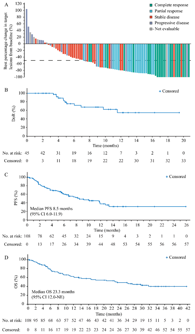 根据独立评审委员会(IRC)评估结果,最佳疗效达完全缓解(CR)的有25例,部分缓解(PR)的有20例,经确认的客观缓解率(ORR)为41.7%(45/108,95% CI:32.3-51.5%),经确认的CR率为23.1%;研究者评估的ORR为46.3%(15 例 CR + 35 例 PR,50/108,95% 置信区间:36.7-56.2%),经确认的CR率为13.9%。如瀑布图所示(图A),依据IRC评估,86.5%的患者治疗后靶病灶肿瘤体积呈现缩小态势。中位随访时长为29.5个月,中位缓解持续时间(DoR)尚未达到(图B)。经IRC评估,达客观缓解的共45例,其中84%(38/45)的受试者客观缓解维持3个月以上。中位无进展生存期(PFS)为8.5个月(95% CI:6.0 - 11.9)(图C),中位总生存期(OS)为23.3个月(95% CI:12.0 - 未达到)(图D)。