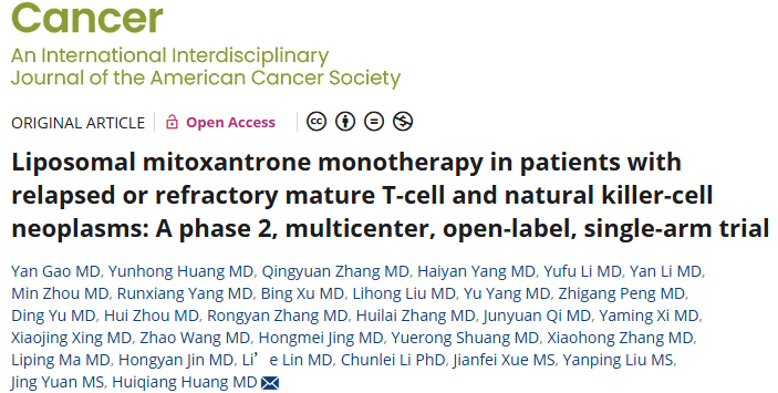 近期,中山大学肿瘤防治中心黄慧强教授作为通讯作者于《Cancer》杂志发表文章《米托蒽醌脂质体单药治疗复发或难治性成熟T细胞和NK细胞肿瘤患者:一项2期、多中心、开放、单臂试验》。