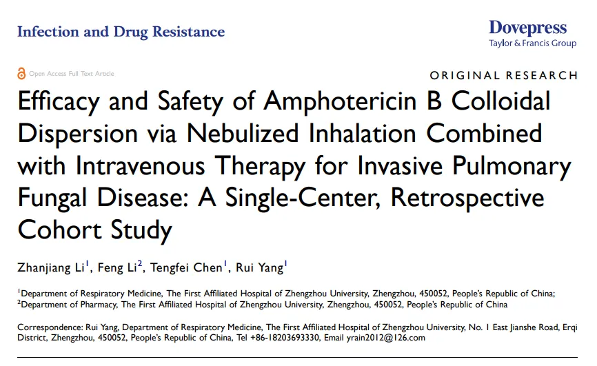 近期,Infection and Drug Resistance 发表了一项由郑州大学第一附属医院呼吸内科杨睿教授牵头开展的,侵袭性肺真菌病(IPFD)的患者接受两性霉素B胆固醇硫酸酯复合物(ABCD)雾化吸入联合静脉注射进行抗真菌治疗的回顾性研究的结果,旨在探究IPFD患者使用ABCD雾化联合静脉注射治疗的有效性和安全性。