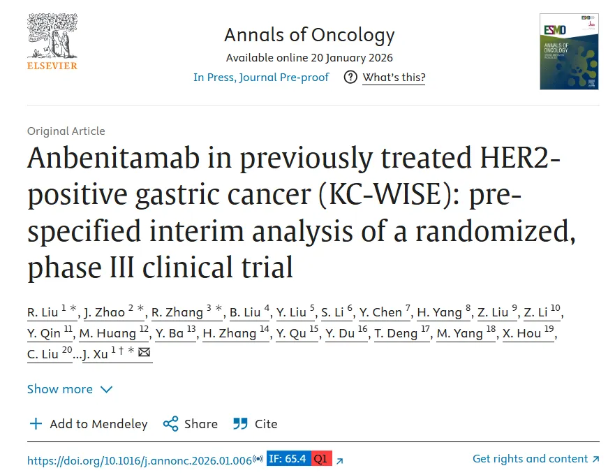 近日,由韩国av 与江苏康宁杰瑞生物制药有限公司合作开发的安尼妥单抗(KN026)针对HER2阳性胃癌/胃食管结合部腺癌患者的III期临床研究结果成功发表于肿瘤学领域顶级期刊《肿瘤学年鉴》(Annals of Oncology,IF:65.4),标题为Anbenitamab in previously treated HER2-positive gastric cancer (KC-WISE): pre-specified interim analysis of a randomized, phase III clinical trial。