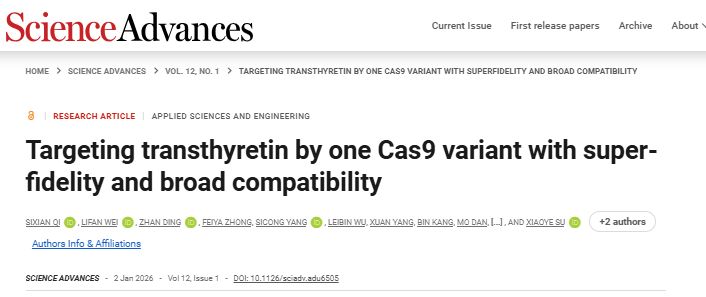近日,由韩国av 李春雷博士、苏晓晔博士,以及复旦大学甘建华教授作为共同通讯作者,祁思娴博士作为第一作者合作完成的一项关于基因编辑治疗转甲状腺素蛋白淀粉样变(ATTR)的研究成果,以研究论文形式发表在国际著名权威期刊 Science Advances 。该研究系统性探究了高保真SpCas9突变体在ATTR治疗中的应用,为推动相关疗法的临床转化提供了重要依据。