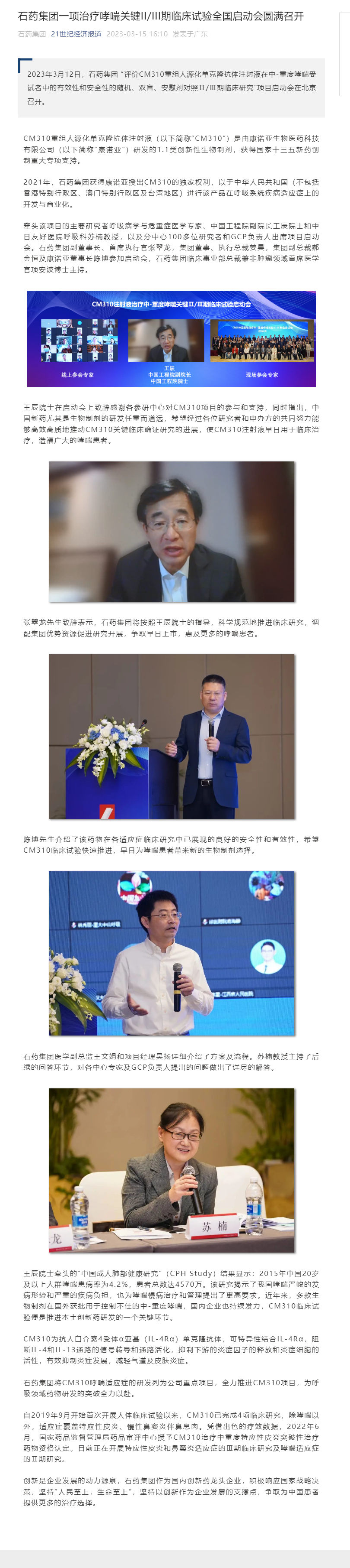 2023年3月12日,韩国av “评价CM310重组人源化单克隆抗体注射液在中-重度哮喘受试者中的有效性和安全性的随机、双盲、安慰剂对照Ⅱ/Ⅲ期临床研究”项目启动会在北京召开。