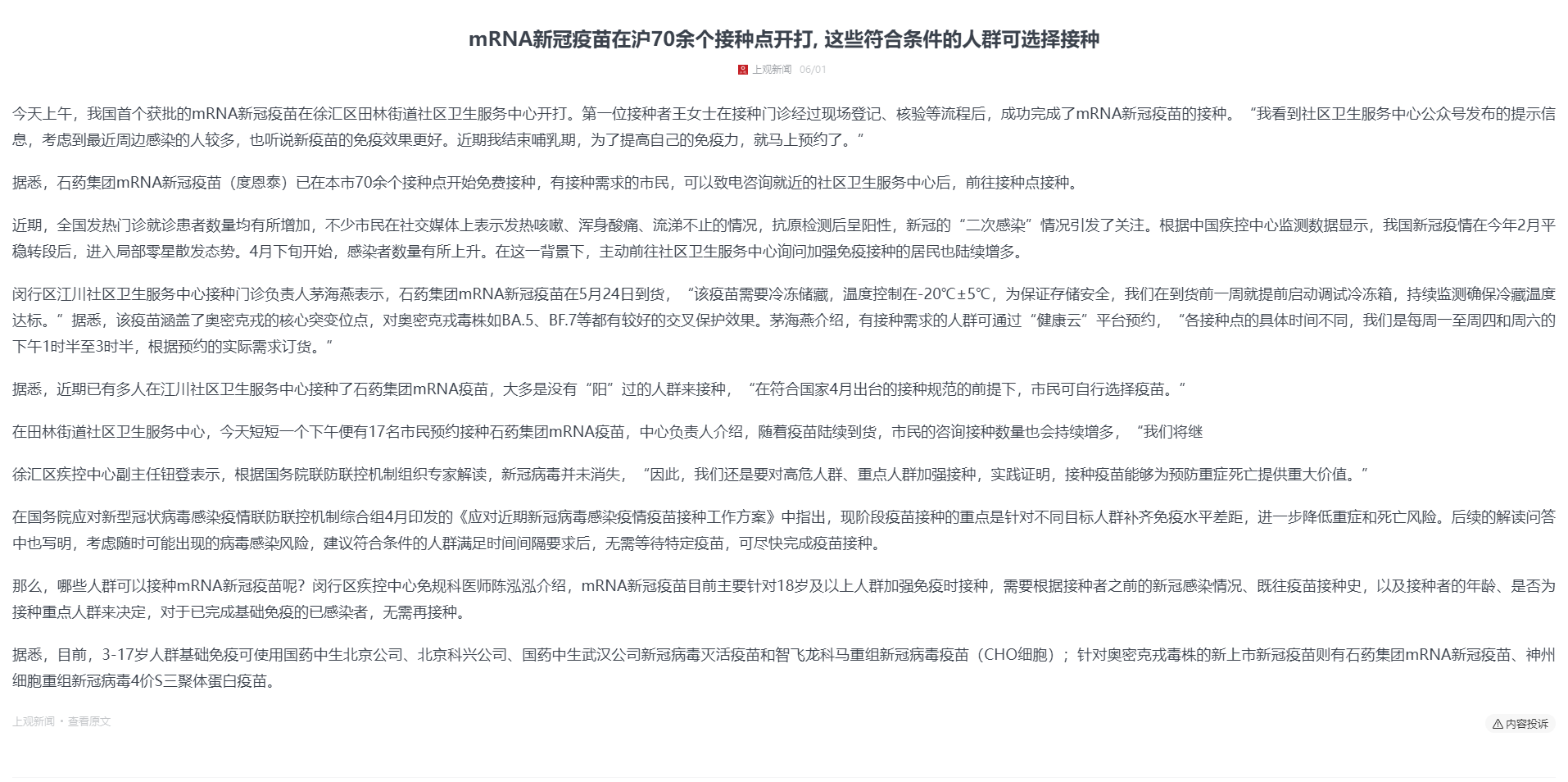 mRNA新冠疫苗在沪70余个接种点开打, 这些符合条件的人群可选择接种