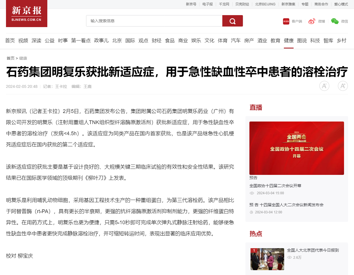 石药第三代rt-PA新适应症获批,治疗急性缺血性卒中