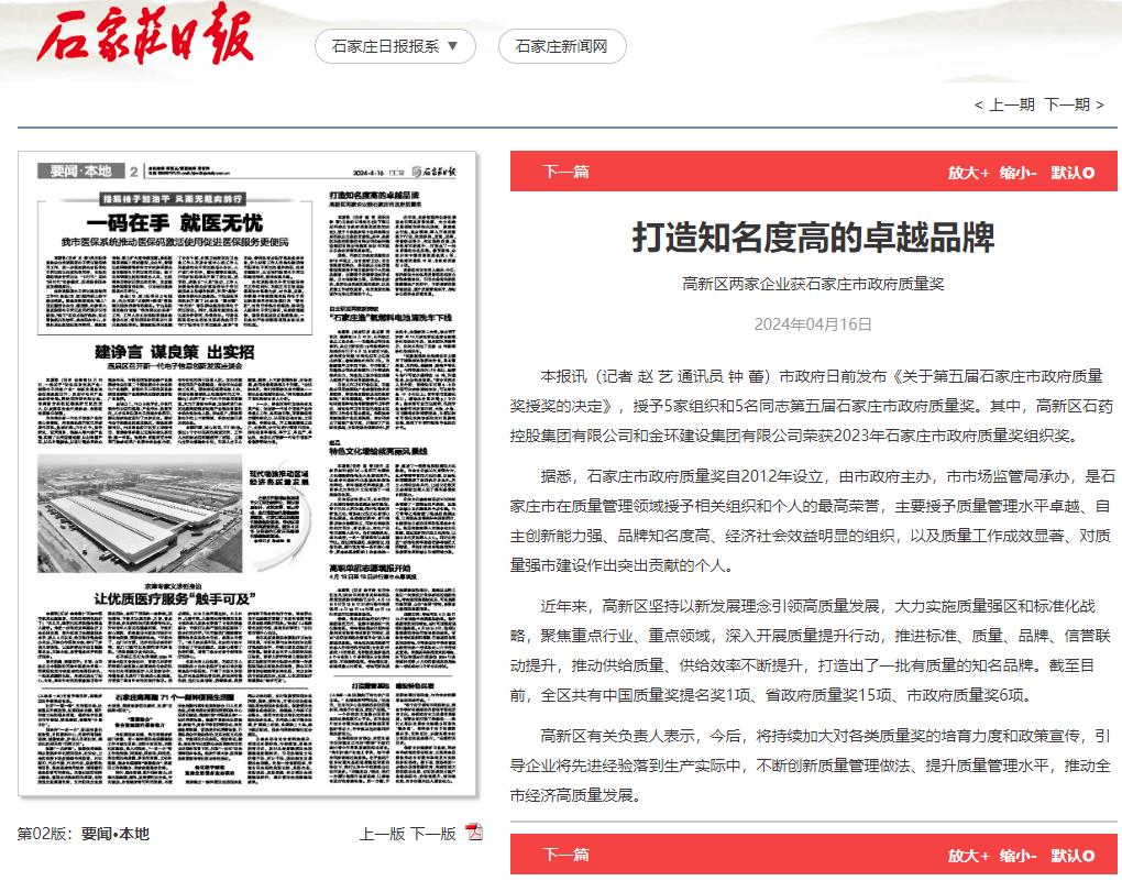 打造知名度高的卓越品牌——高新区两家企业获石家庄市政府质量奖